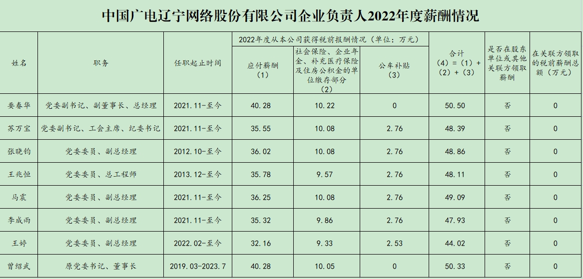 中國廣電遼寧網(wǎng)絡(luò)股份有限公司企業(yè)負(fù)責(zé)人2022年度薪酬情況